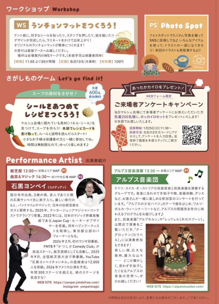 スープのブース他、ワークショップやスタンプラリーなど、いろいろな催しがあります。