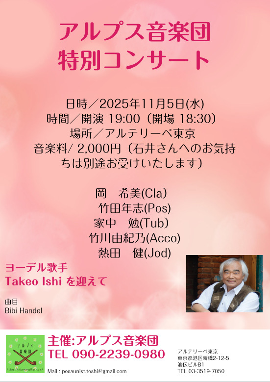 今回は、アルプス音楽団特別コンサートとして、石井さんをゲストにお迎えします。